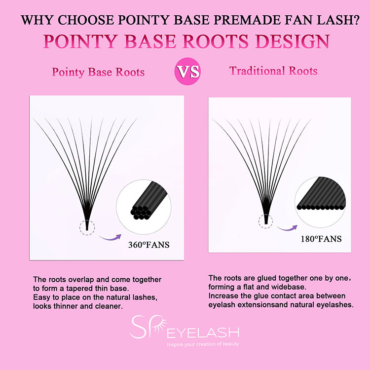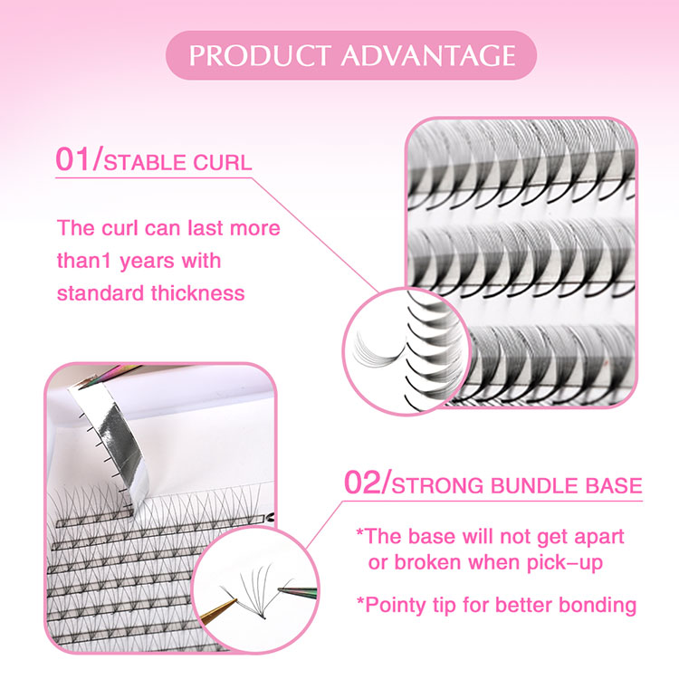 As raízes da base russa de base pontiagudas chicotes de fãs estão fortemente amarrados. A forma geral da base pontiaguda pré-fabricada em forma de ventilador é como a letra V, com a base firmemente ligada para formar um fim cônico nítido. Esse design inovador faz com que os cílios estendidos pareçam mais finos e mais naturais, pareçando cílios reais crescendo naturalmente das raízes, aumentando a beleza geral.