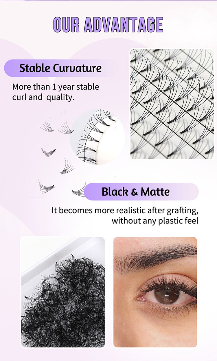 Uma vez enxertados, esses cílios se tornam ainda mais realistas, livres de qualquer sensação de plástico. Eles aprimoram a aparência natural dos olhos, dificultando a distinção entre os fãs pré -fabricados 8D e os cílios naturais.