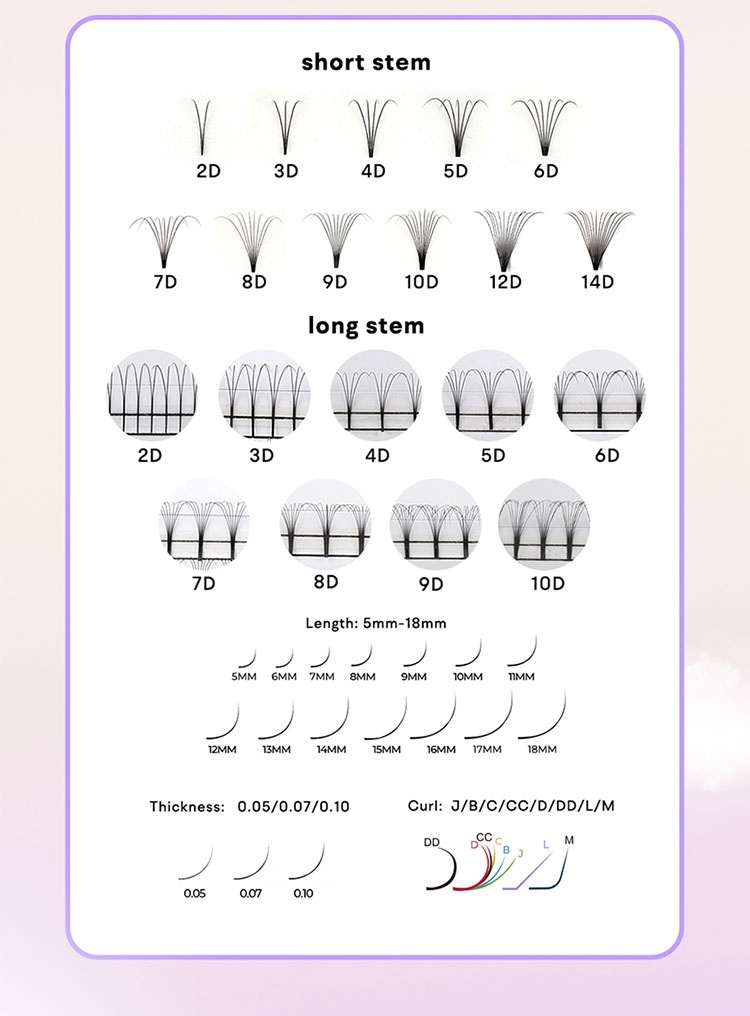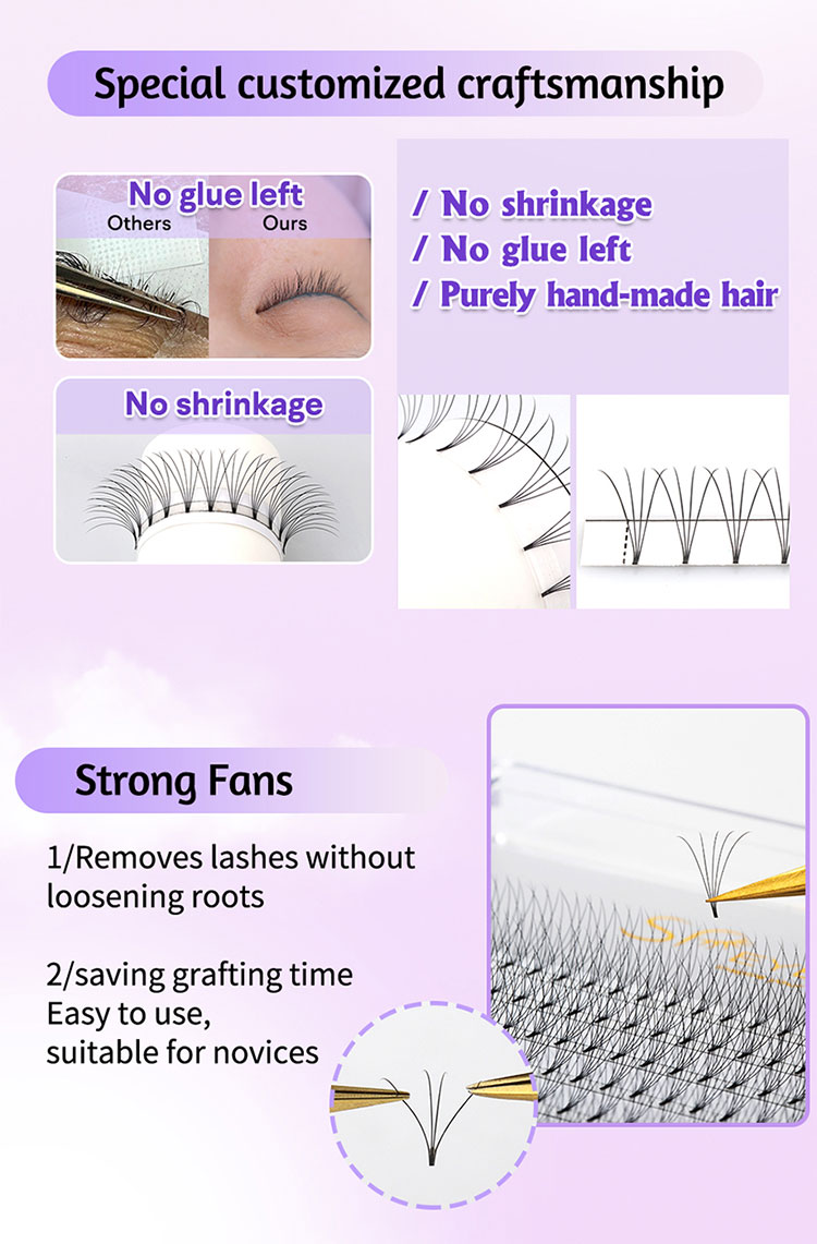Projetados com os lash Artists em mente, os fãs pré -fabricados 8D cílios de caule curto são fáceis de manipular, simplificando a criação de belos conjuntos de cílios de volume. O design permite que os profissionais mostrem suas habilidades com eficiência, garantindo excelentes resultados.