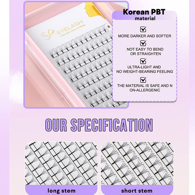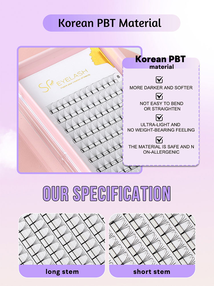 Os fãs pré -fabricados 8D cílios de caule curto são feitos de material 100% coreano PBT, tornando -os mais macios, mais escuros e apresentando fãs amplos com pontas mais finas. Esse material superior imita os cílios naturais, oferecendo aos clientes uma experiência luxuosa e confortável de desgaste que melhora sua beleza sem desconforto.